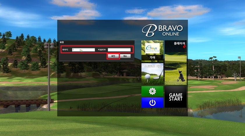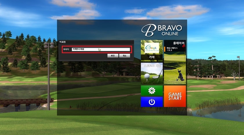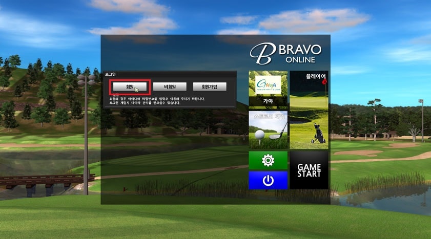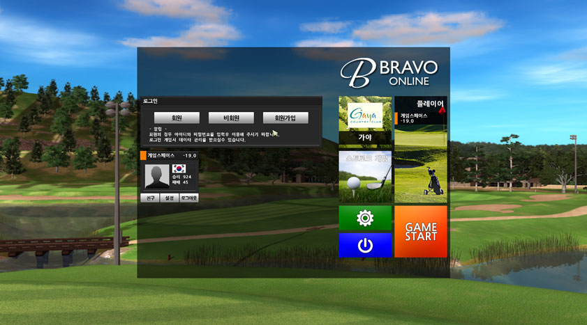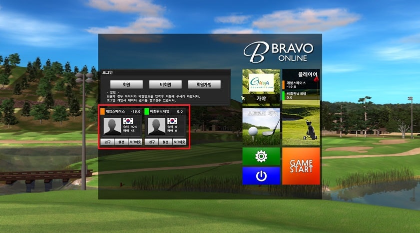 회원과 비회원 로그인한 화면입니다.로그인 후 Game Start 를 누르시면 기본 설정과 선택되어진 코스로 게임이 시작됩니다.